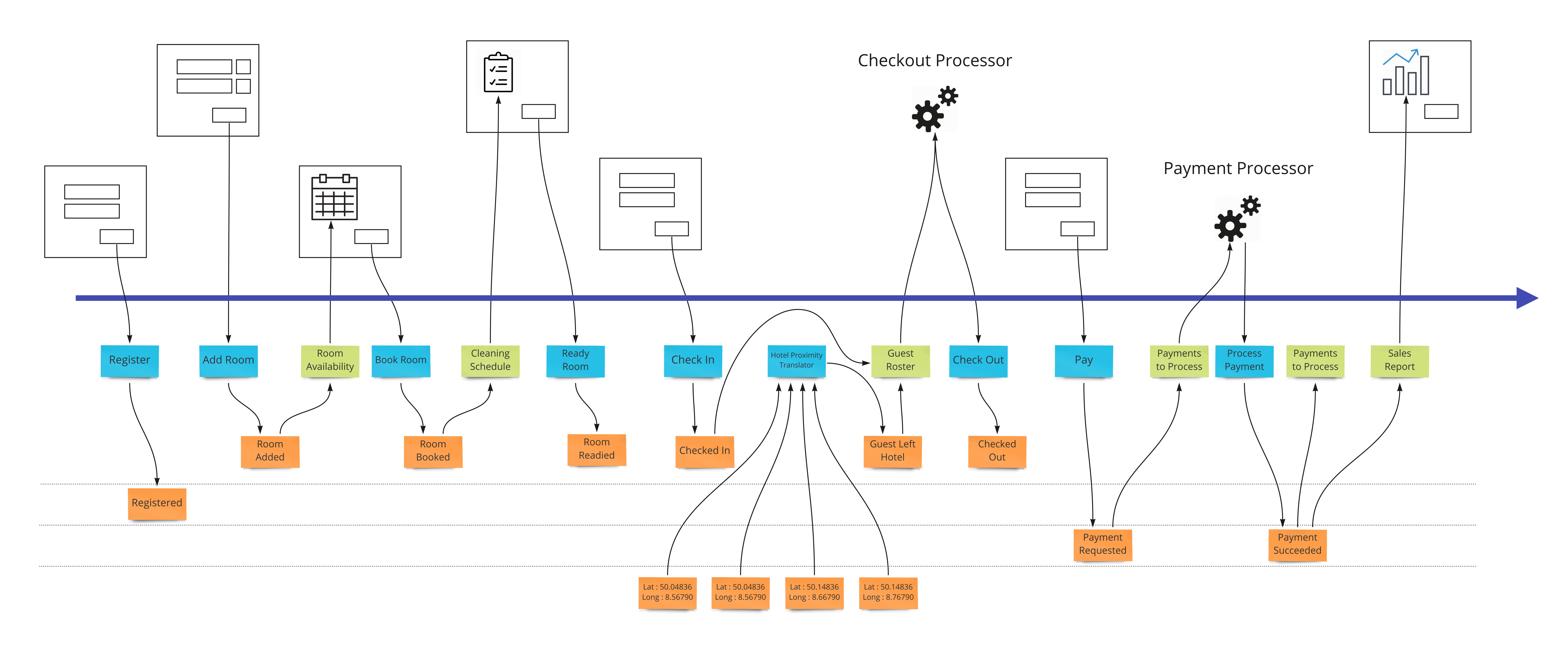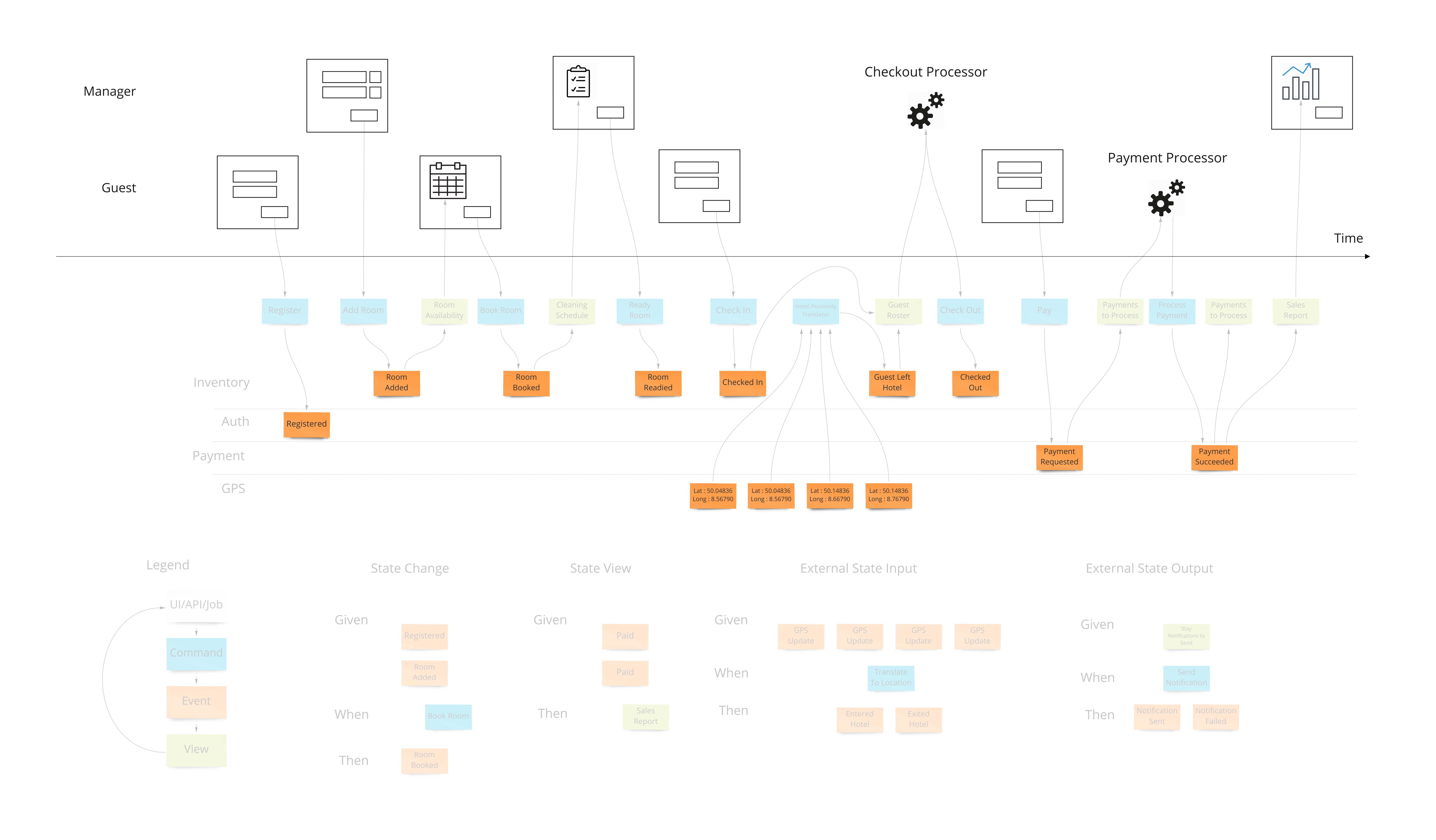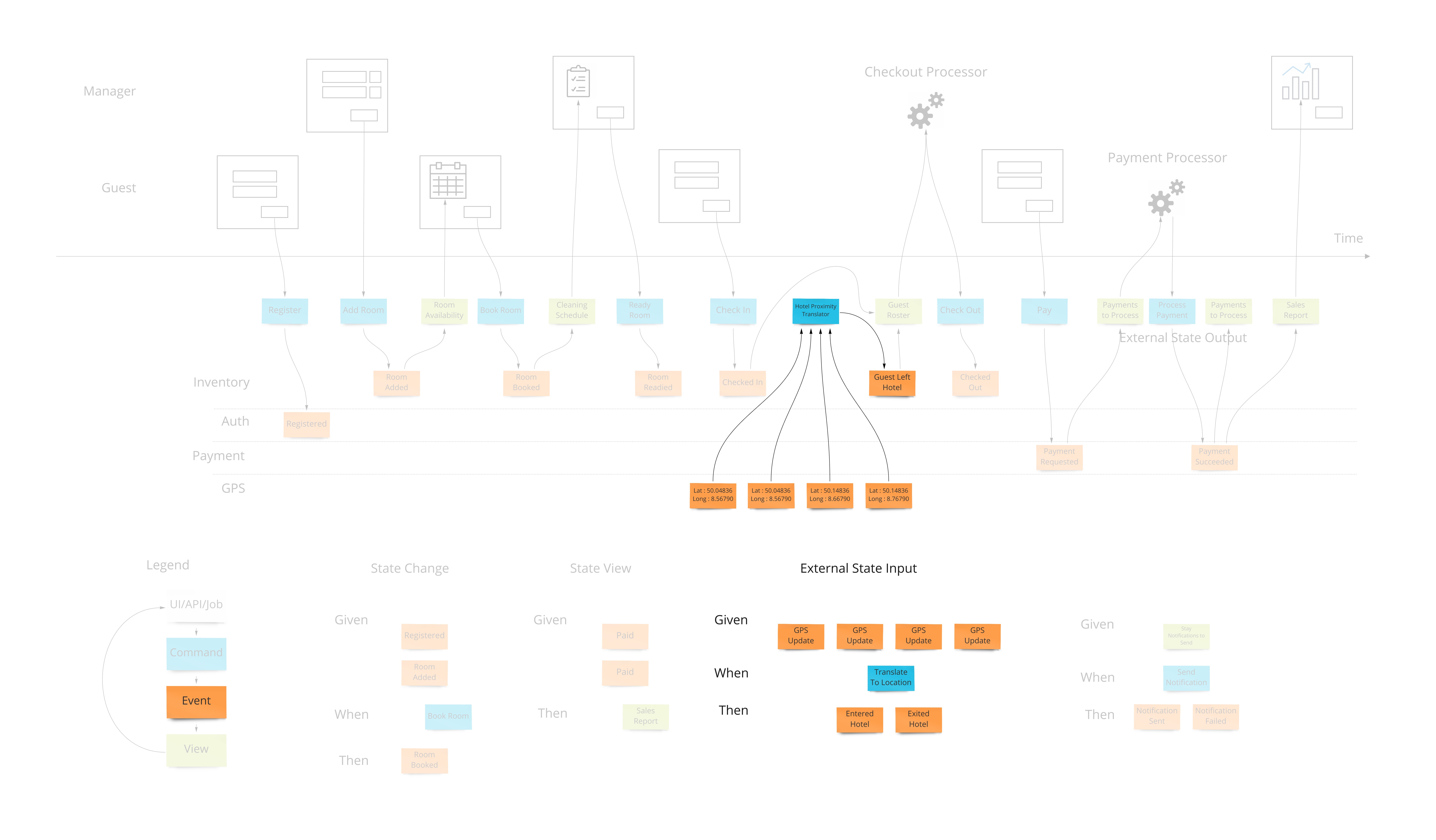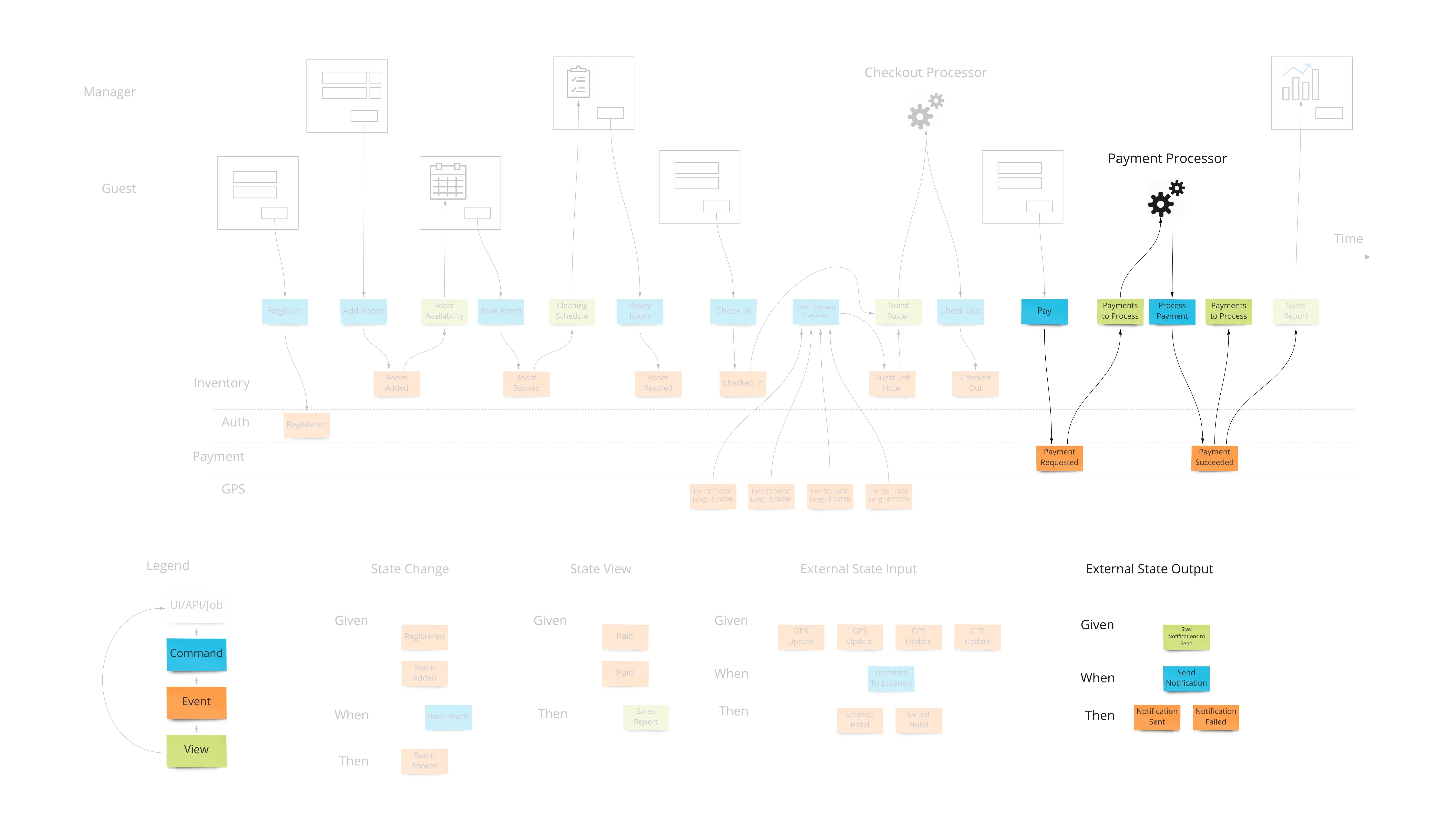 Our system is going to need to communicate with external services. When the guests in our hotel are paying for their stay when they check out, our system makes a call to a payment processor. We can make the concept of how this occurs with the idea of a “todo list” for some processor in our system. This todo list shows tasks we need to complete. Our processor goes through that list from time to time (could be milliseconds or days) and sends out a command to the external system to process the payment, as an example. The reply from the external system is then translated into an event that we store back in our system. This way we keep the building blocks that we use in our system as something that’s meaningful to us.