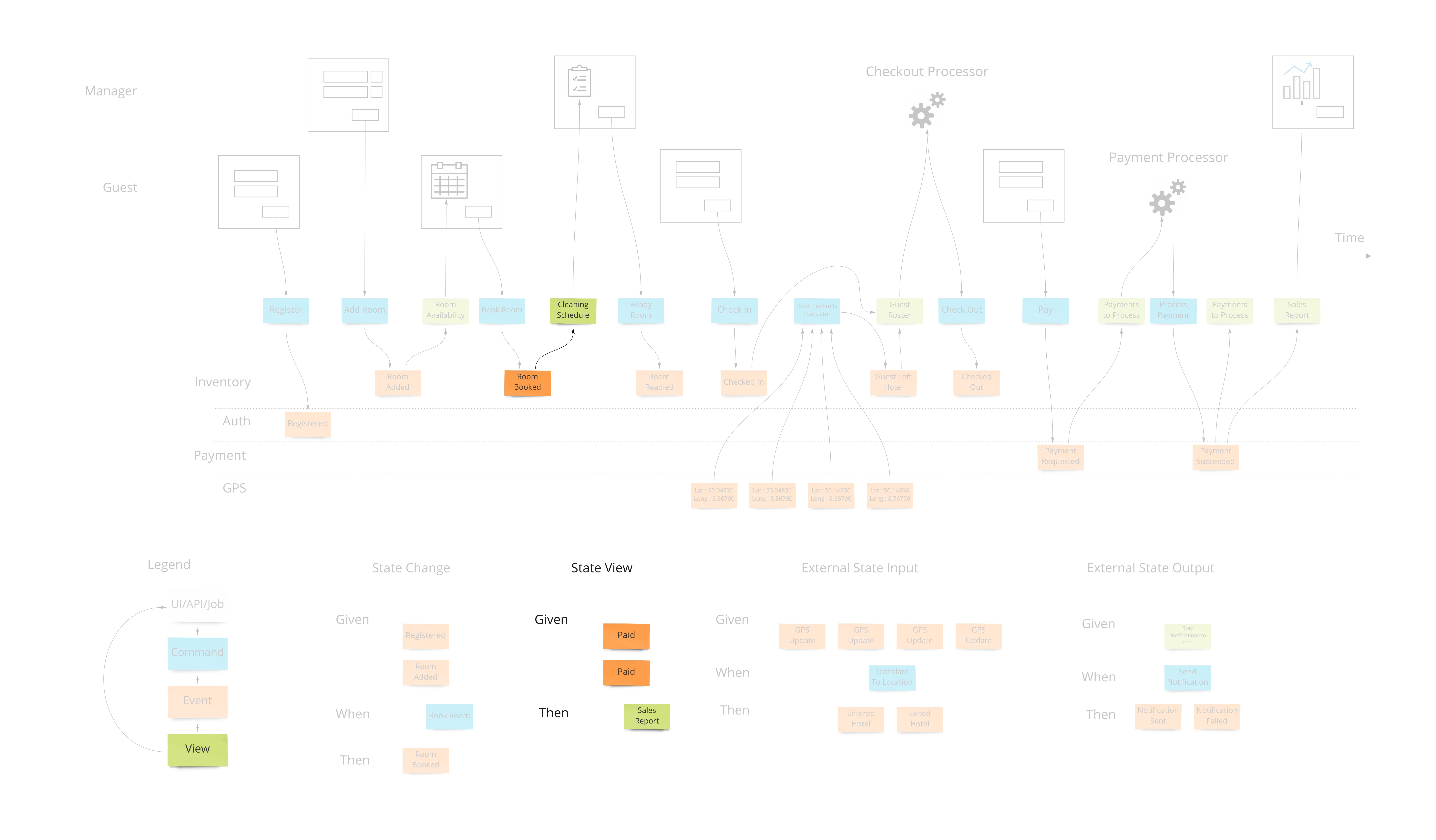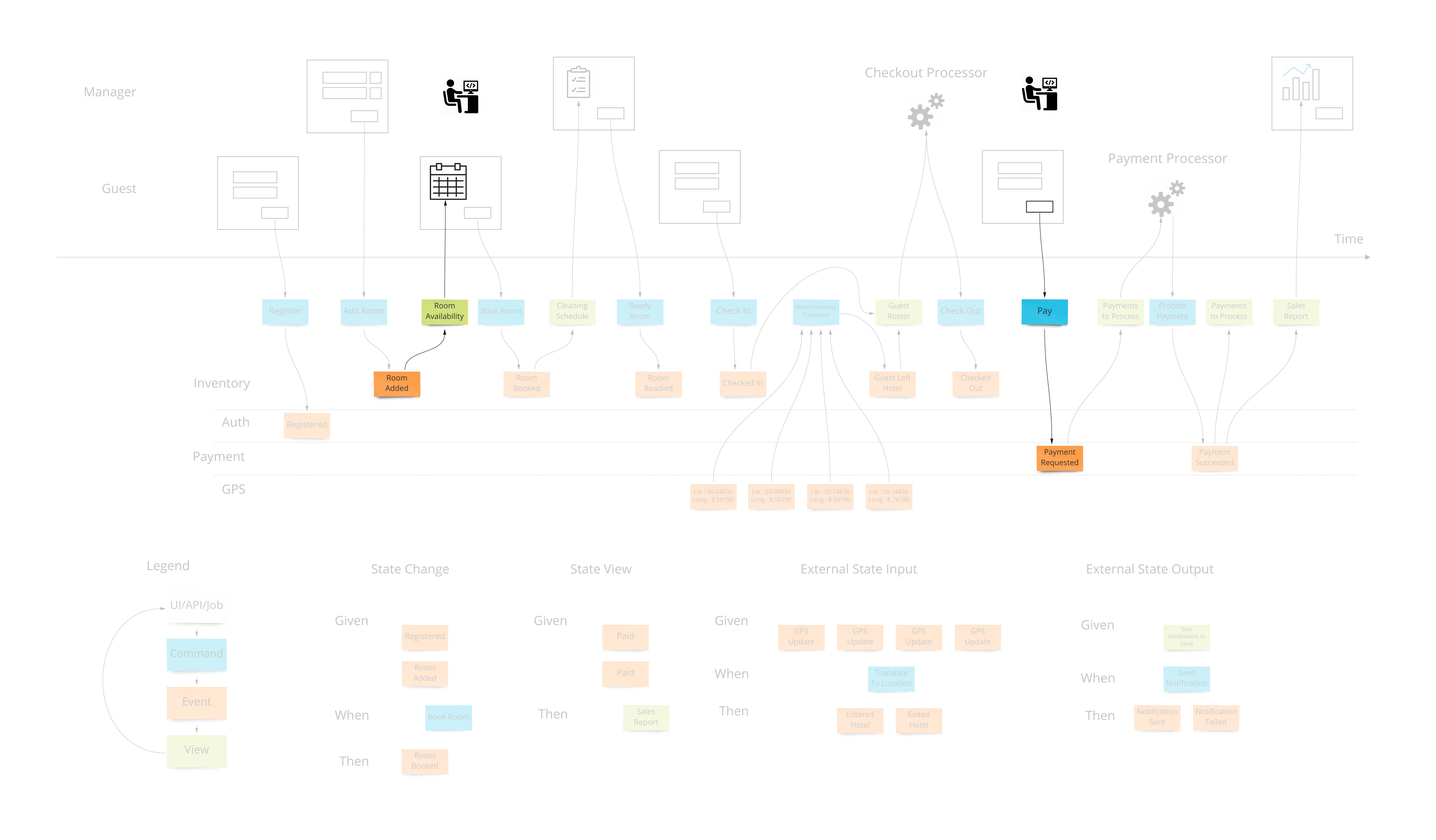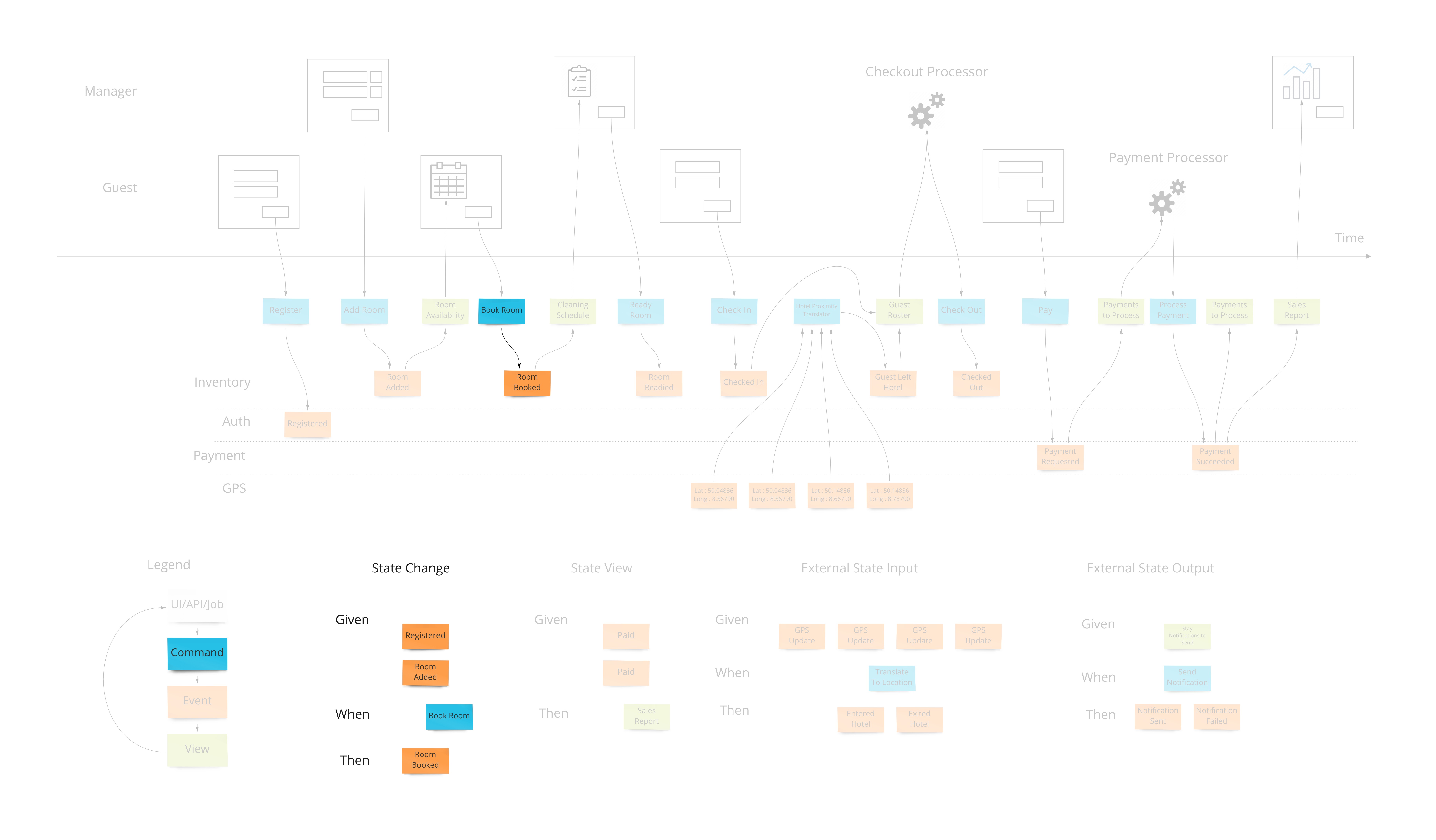 We have someone explain the goals of the project and other information. The participants then envision what system would look and behave like. They put down all the events that they can conceive of having happened. Here we gently introduce the concept that only state-changing events are to be specified. Often, people will name “guest viewed calendar for room availability”. We put those aside for now - they are not events.